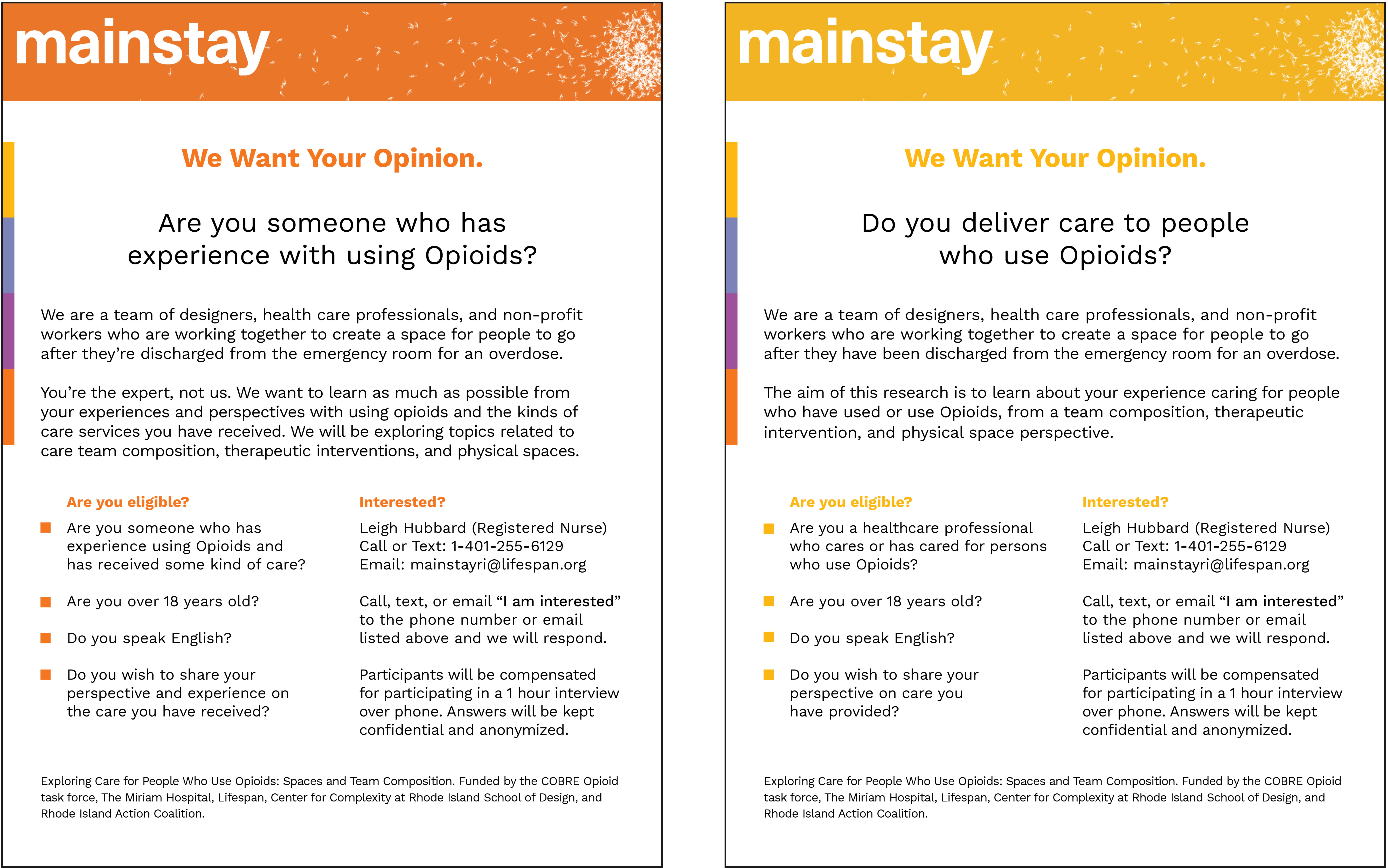 An IRB research study to explore notions of care from the perspective of people who have experienced an overdose and people who have delivered care. Image: Interview research recruitment posters.